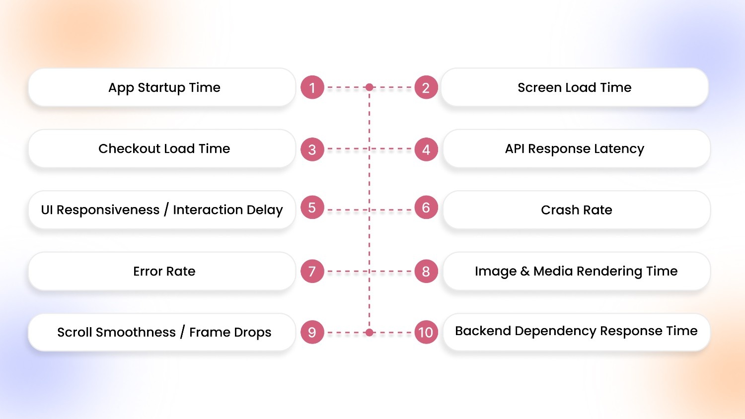 Mobile app performance metrics are quantifiable indicators that measure how efficiently an app loads, responds, processes actions, and maintains stability across devices and network conditions. They evaluate startup speed, latency, crash frequency, rendering smoothness, and resource utilization to ensure consistent, friction-free user experiences. This directly impacts usability and conversion readiness.