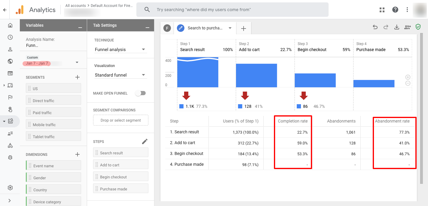 This funnel has a few steps. The first step contains event 'view_search_result' which filters out users who searched for a product. The second step includes event 'add_to_cart' which includes only those users who add the product to cart following the previous step. The third step includes users who clicked on checkout following the addition of the product to the cart. The final step includes the event ‘ecommerce_purchase’ that filters out customers who have finally made the purchase.