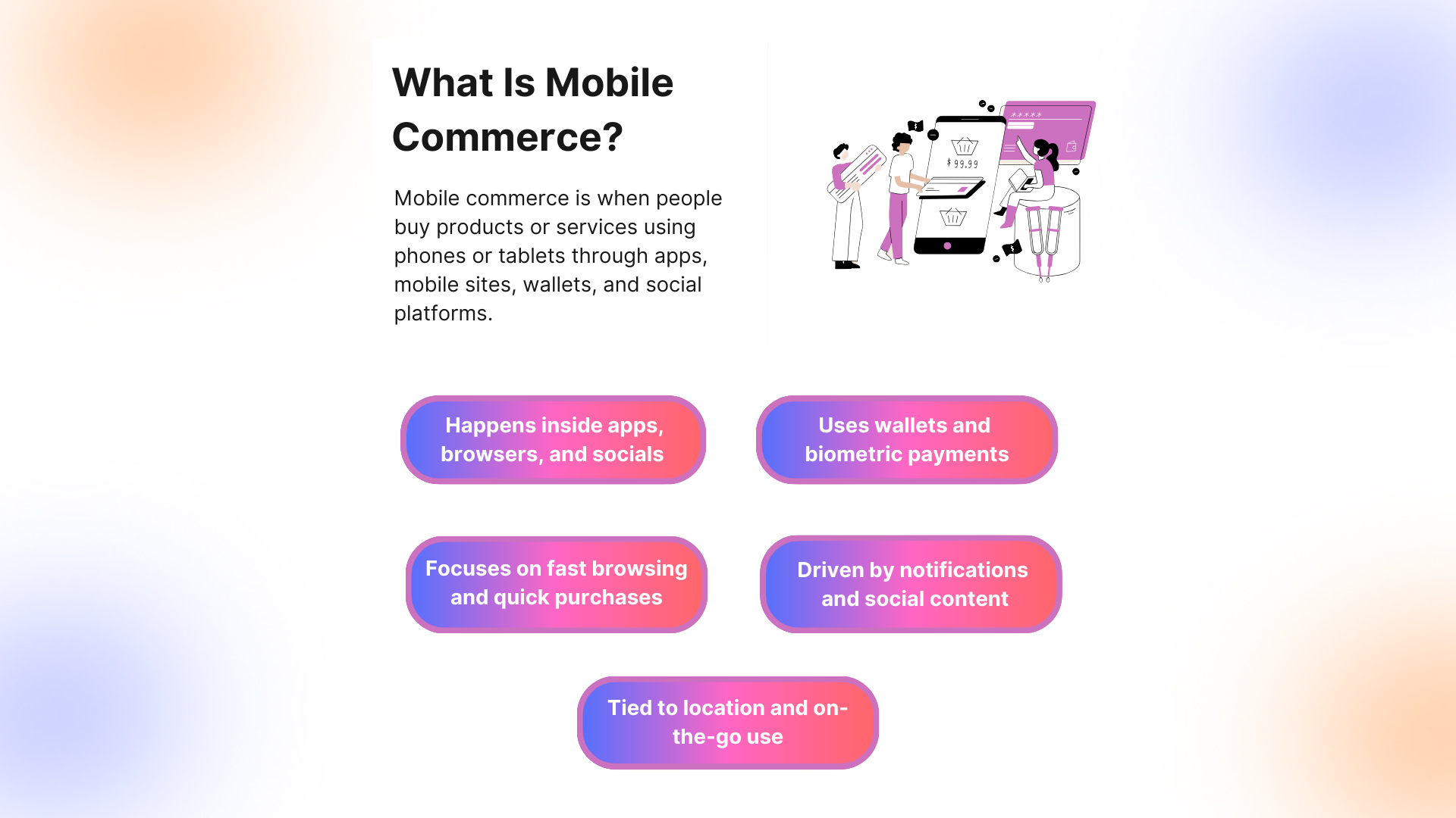 Mobile commerce (m-commerce) is when people buy products or services using their phones or tablets. This includes online shopping in apps, buying through mobile websites, paying with digital wallets, and purchasing through social media platforms.