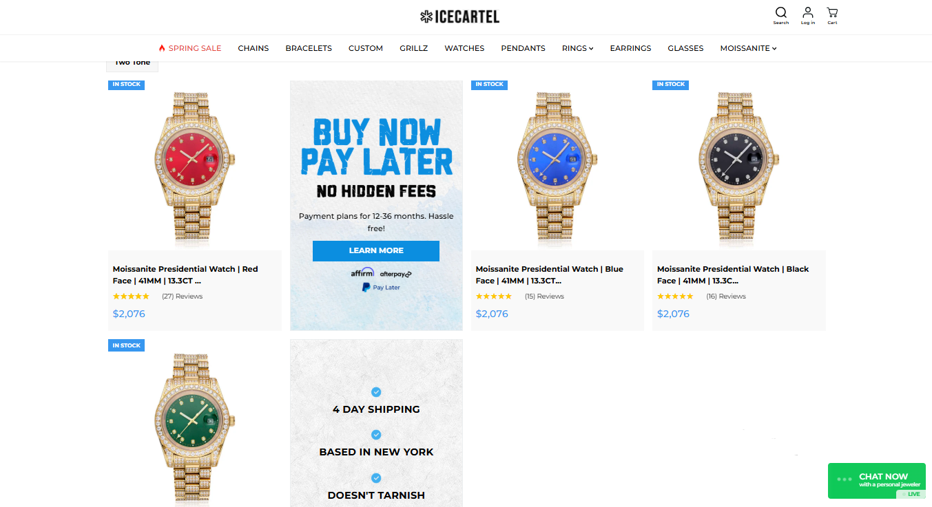 IceCartel sells iced-out watches in the $1,800–$2,500 range. That price range demands trust and flexible payments, especially on mobile.