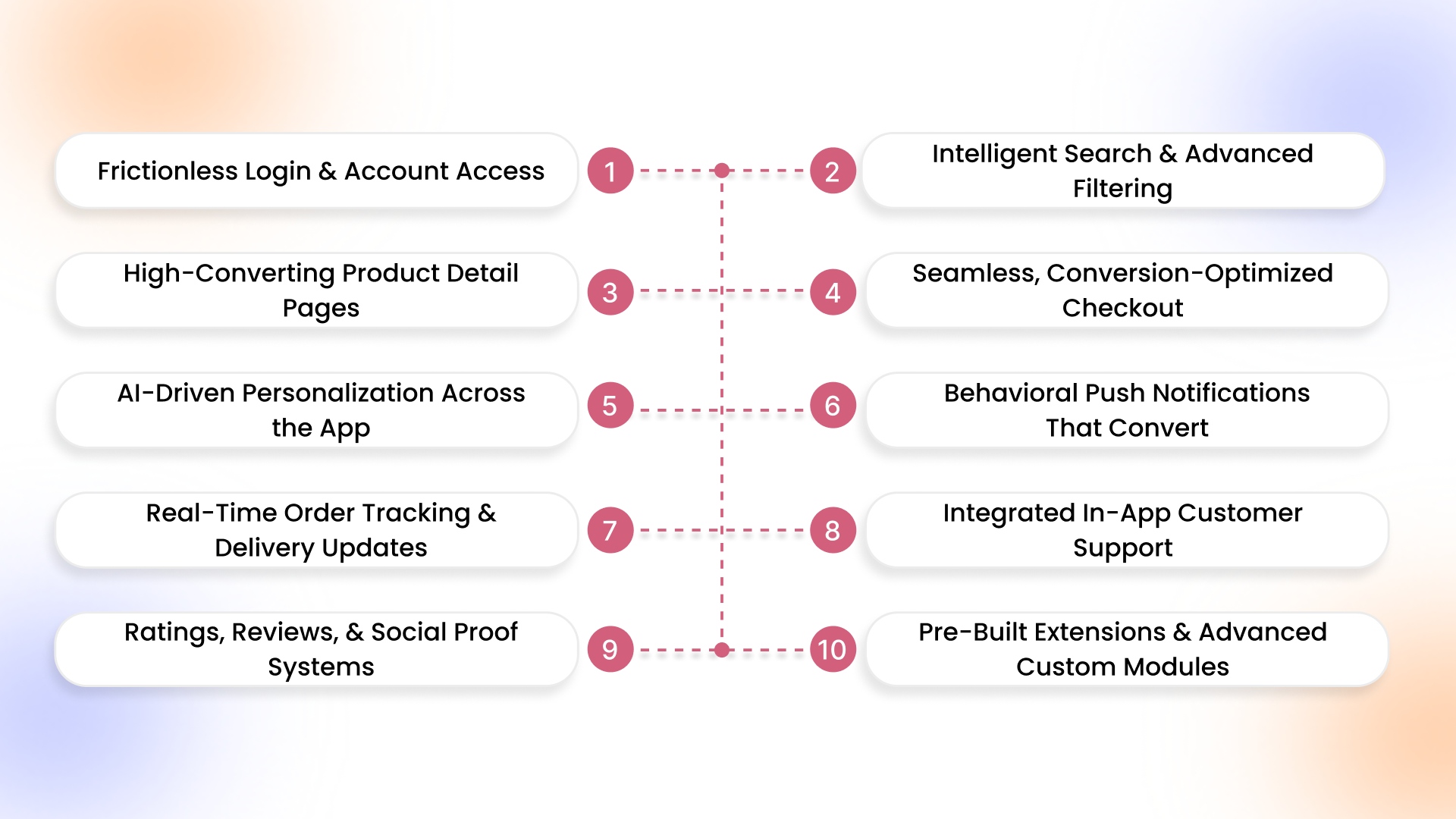 Not every feature improves revenue. This ecommerce mobile app features list focuses on the ten capabilities that directly impact conversion rates, average order value, retention, and repeat purchases. Together, they help you build an app that performs, not just exists. Let's learn about these revenue-driven features.
