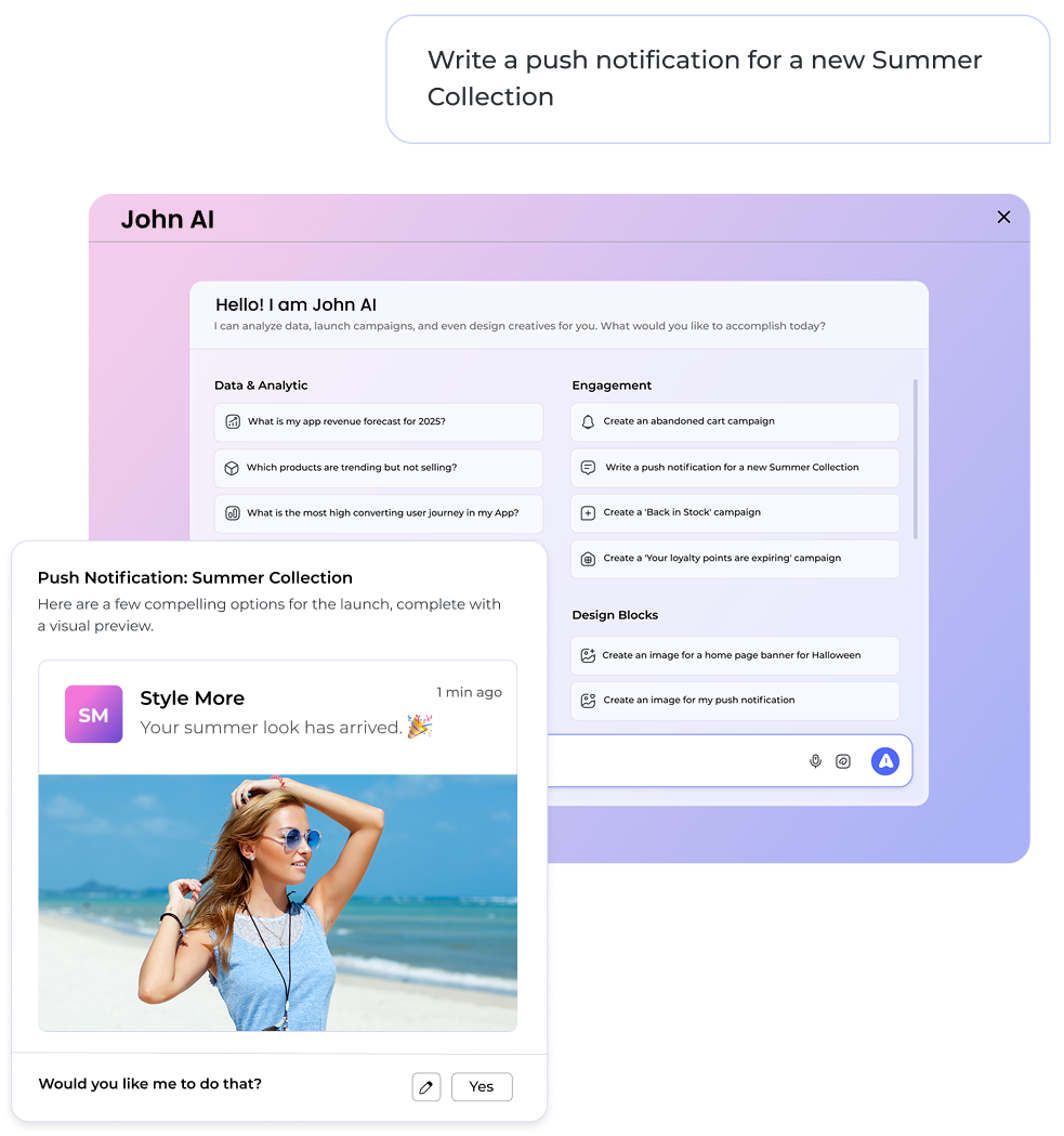 What: John writes and schedules push notifications, complete with dynamic variables (like names, offers, or products), optimized for open rates and timing.
