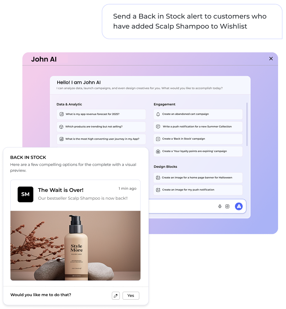 What: Just tell John: “Send a Back in Stock alert” or “Run a VIP sale.” He handles targeting, timing, and delivery.