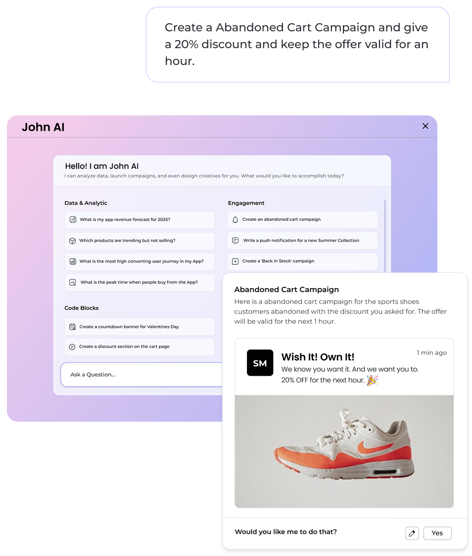 Built into Appmaker, John AI takes care of analytics, campaigns, and optimization so you can focus on running your brand, not running after tasks.